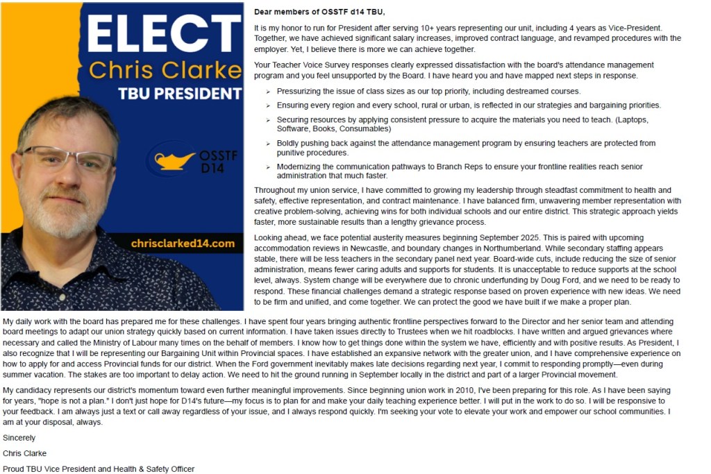 Vote for experienced, empathetic, and effective leadership that puts members first. I have the experience to be an effective TBU President. I have a resume of results that have improved working conditions at every worksite. I am ready to be TBU President.